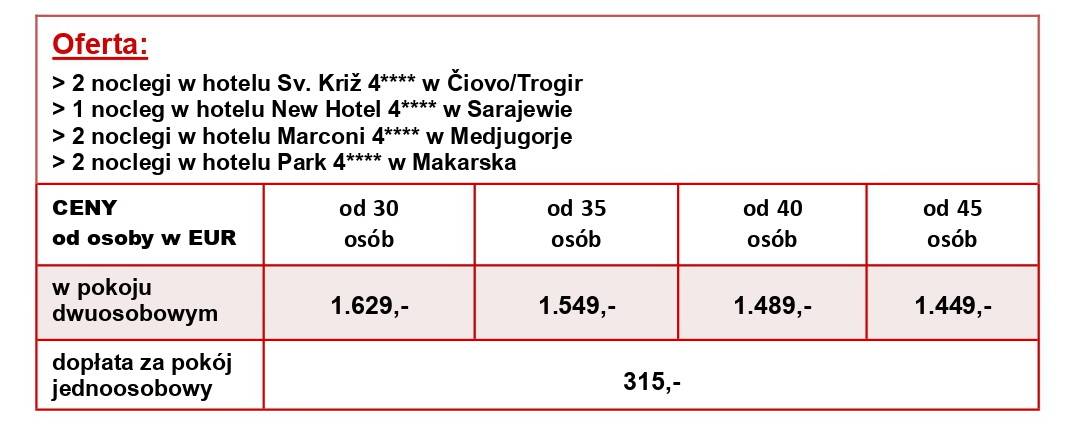 Śniadanie. Przejazd do Sinj – jednego z najbardziej znanych miejsc pielgrzymkowych w Chorwacji. Sinj jest dumą i klejnotem regionu Cetina. Magnesem przyciągającym turystów jest kościół Wniebowzięcia Najświętszej Maryi Panny w centrum Sinj. Każdego roku w święto Wniebowzięcia Najświętszej Maryi Panny, 15 sierpnia, tłumy pielgrzymów gromadzą się przy dzwonnicy, aby wziąć udział w wielkiej procesji. Wcześniej odwiedzają sanktuarium, aby obejrzeć obraz cudownej Madonny. Msza św. Zwiedzanie muzeum franciszkanów i muzeum Alka. Dalej do Bośni i Hercegowiny nad piękne jezioro Rama. Zwiedzanie klasztoru franciszkanów Rama z kościołem Wniebowzięcia Najświętszej Maryi Panny i muzeum. Sinj i Rama są połączone cudownym obrazem Matki Boskiej. Następnie przejazd wzdłuż rzeki Neretva do Sarajewa. Kolacja i nocleg w hotelu w Sarajewie.